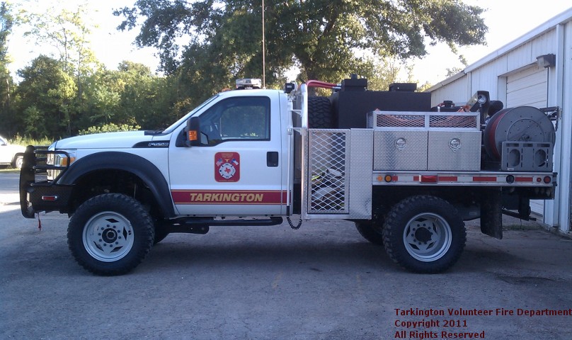 The Tarkington VFD received a $36,000 grant from the Texas Forest Service for a CAFS skid unit in December 2010. The decision was made to use the grant towards purchasing a complete truck. Specifications were compiled and a request for bids went out. In March 2011, Freedom Fire Equipment as awarded the contract and the truck was delivered in September 2011. The truck is the first responding unit on wildland and automobile fires. With it's auxillary engine powered pump it can pump and roll and the CAF system greatly enhances the firefighting capabilities.
