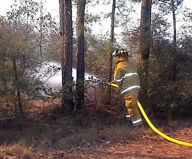 Tarkington firefighter Albert Crawford works to extinguish a brush fire on Ridge Road.