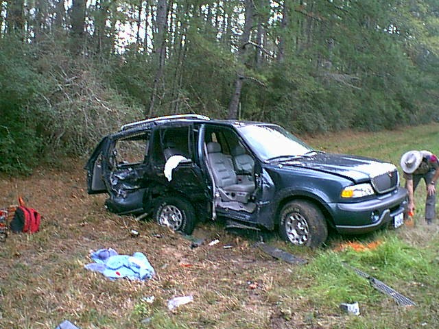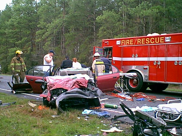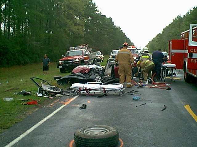 Tarkington,Cleveland, and Hardin firefighters work to free the victims of this two-car accident on SH105.